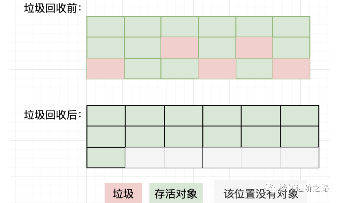 对于标记--清除算法,你一定会清楚看到,在进行垃圾回收之后,堆空间有大量的碎片,出现了不规整的情况。在给大对象分配内存的时候,由于无法找到足够的连续的内存空间,就不得不再一次触发垃圾收集。另外,如果Java堆中存在大量的垃圾对象,那么垃圾回收的就必然进行大量的标记和清除动作,这个势必造成回收效率的降低。