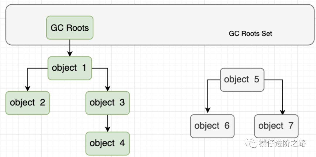 就像上图的那样,绿色部分的对象都在GC Roots的引用链上,就不会被垃圾回收器回收,灰色部分的对象没有在引用链上,自然就被判定为可回收对象。
