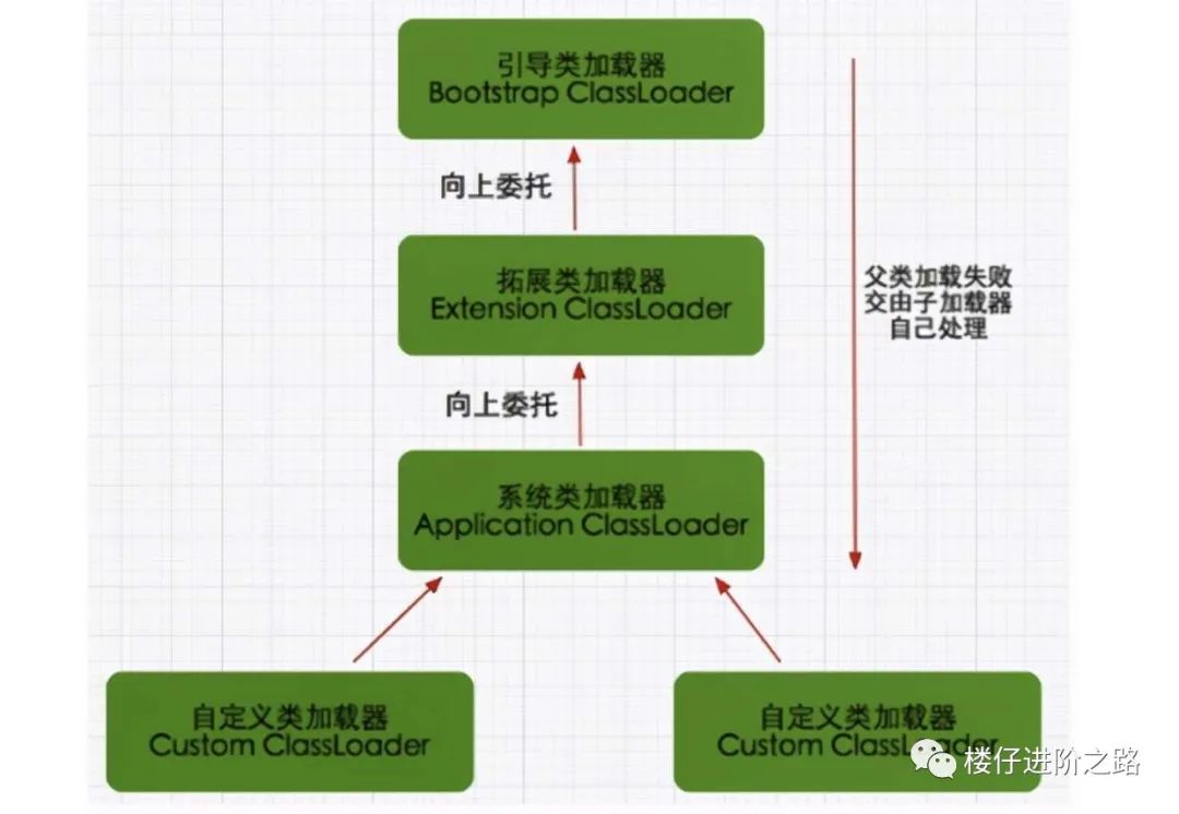 双亲委派模型的工作流程是:如果一个类加载器收到了类加载的请求,它首先不会自己去尝试加载这个类,而是把请求委托给父加载器去完成,依次向上,因此,所有的类加载请求最终都应该被传递到顶层的启动类加载器中,只有当父加载器在它的搜索范围中没有找到所需的类时,即无法完成该加载,子加载器才会尝试自己去加载该类。