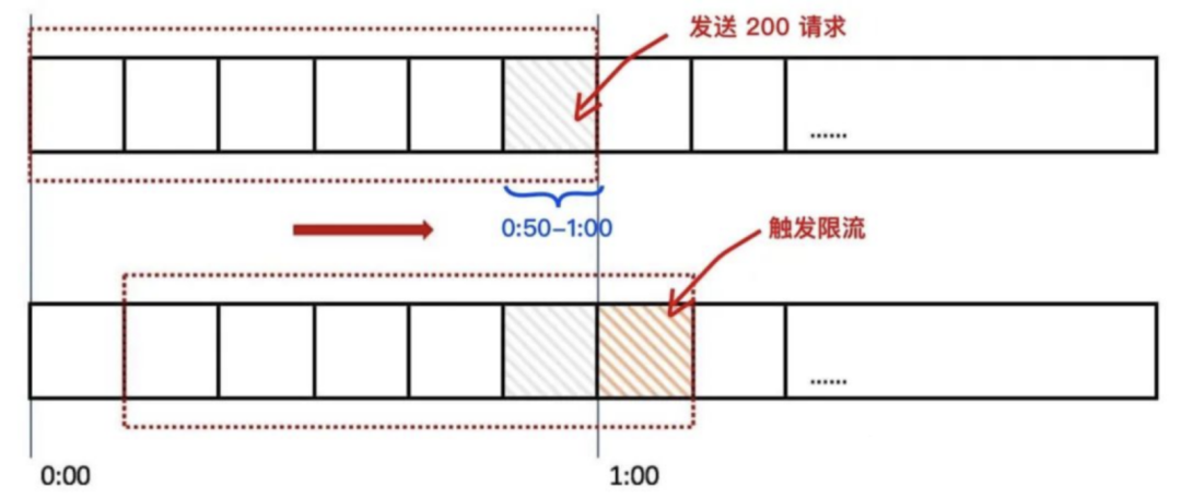 当用户在 0:59 秒钟发送了 200 个请求就会被第六个格子的计数器记录 +200,当下一秒的时候时间窗口向右移动了一个,此时计数器已经记录了该用户发送的 200 个请求,所以再发送的话就会触发限流,则拒绝新的请求。
