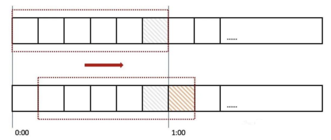 上图中我们用红色的虚线代表一个时间窗口(一分钟),每个时间窗口有 6 个格子,每个格子是 10 秒钟。每过 10 秒钟时间窗口向右移动一格,可以看红色箭头的方向。我们为每个格子都设置一个独立的计数器 Counter,假如一个请求在 0:45 访问了那么我们将第五个格子的计数器 +1(也是就是 0:40~0:50),在判断限流的时候需要把所有格子的计数加起来和设定的频次进行比较即可。