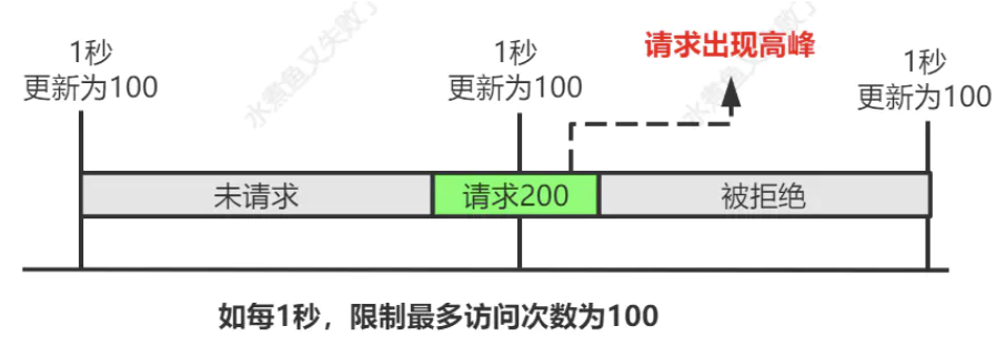 那么在 1 秒钟内这个用户发送了 2 倍的请求,这个是符合我们的设计逻辑的,这也是计数器方法的设计缺陷,系统可能会承受恶意用户的大量请求,甚至击穿系统。这种方法虽然简单,但也有个大问题就是没有很好的处理单位时间的边界。