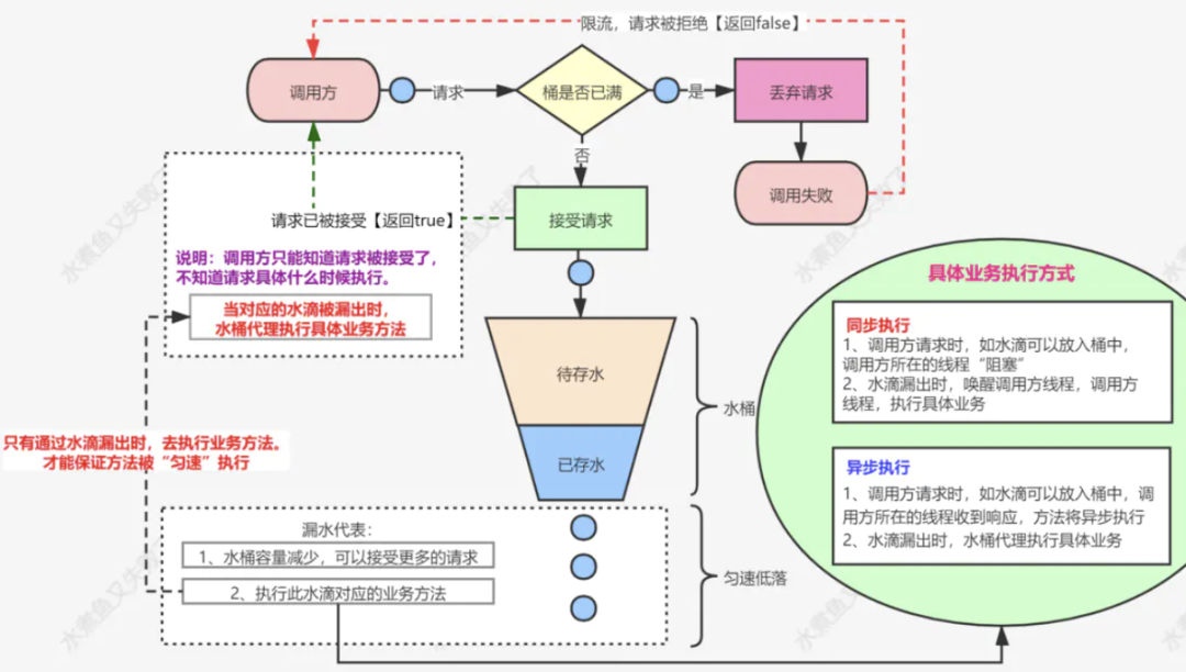 一个固定容量的桶,有水流进来,也有水流出去。对于流进来的水来说,我们无法预计一共有多少水会流进来,也无法预计水流的速度。但是对于流出去的水来说,这个桶可以固定水流出的速率(处理速度),从而达到流量整形和流量控制的效果。