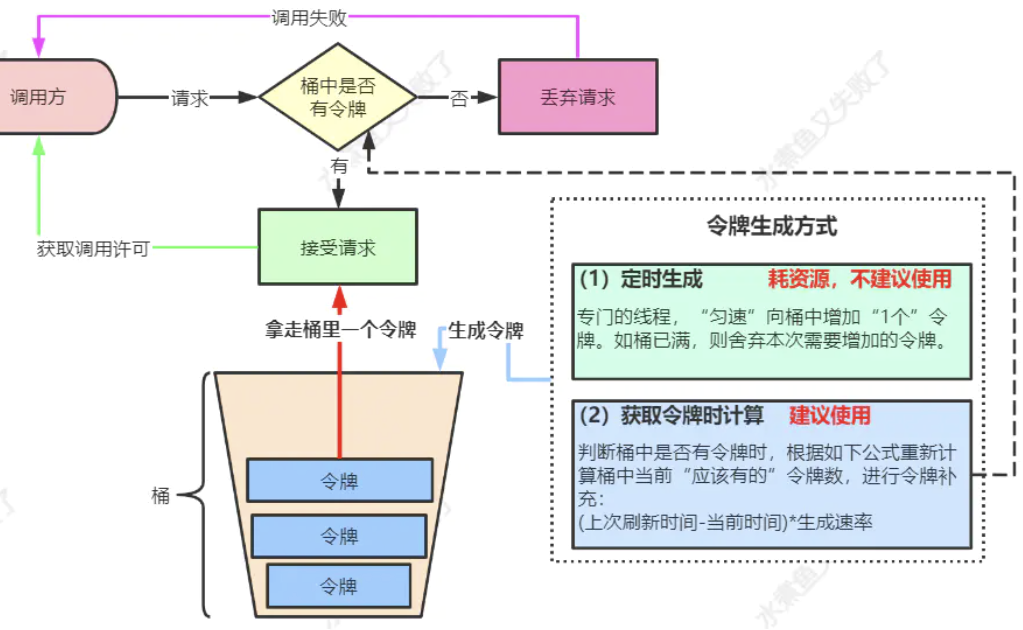 我们有一个固定的桶,桶里存放着令牌(token)。一开始桶是空的,系统按固定的时间(rate)往桶里添加令牌,直到桶里的令牌数满,多余的请求会被丢弃。当请求来的时候,从桶里移除一个令牌,如果桶是空的则拒绝请求或者阻塞。