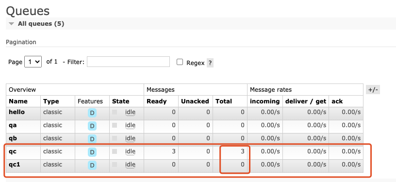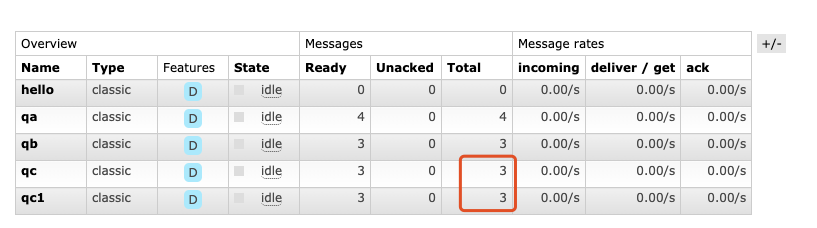 当我们把队列中的数据全部消费掉,然后重新执行生成者后,会发现qc和qc1中都有3条待消费的数据,因为绑定的key都是“ccc”,所以两者的数据是一样的: