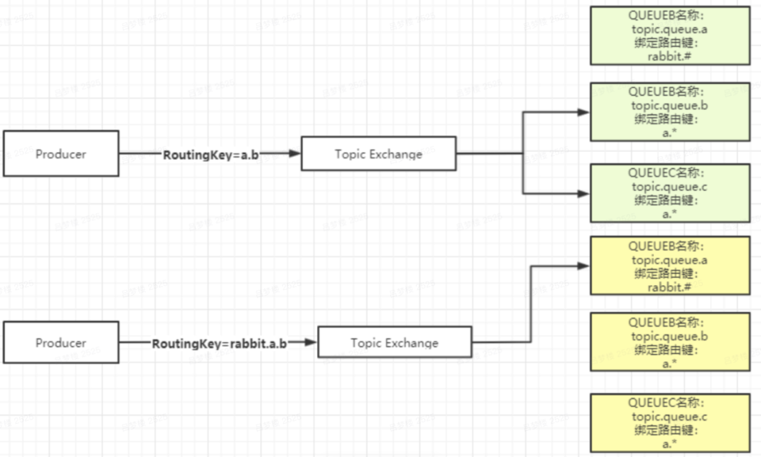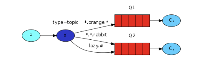 Topic Exchange:直接翻译的话叫做主题交换机,如果从用法上面翻译可能叫通配符交换机会更加贴切。这种交换机是使用通配符去匹配,路由到对应的队列。通配符有两种:"*" 、 "#"。需要注意的是通配符前面必须要加上"."符号。