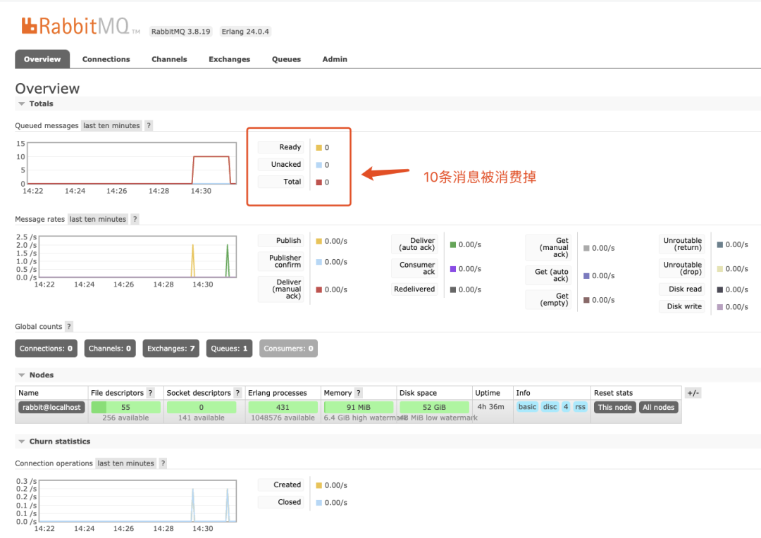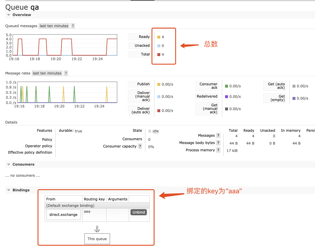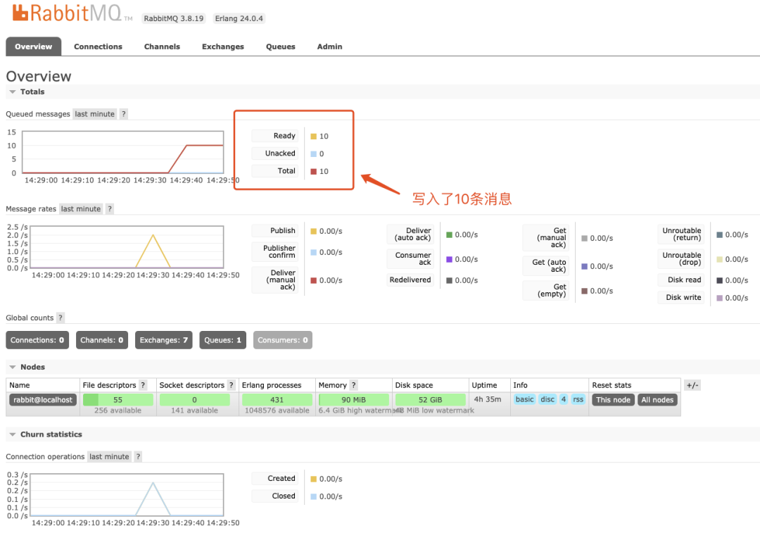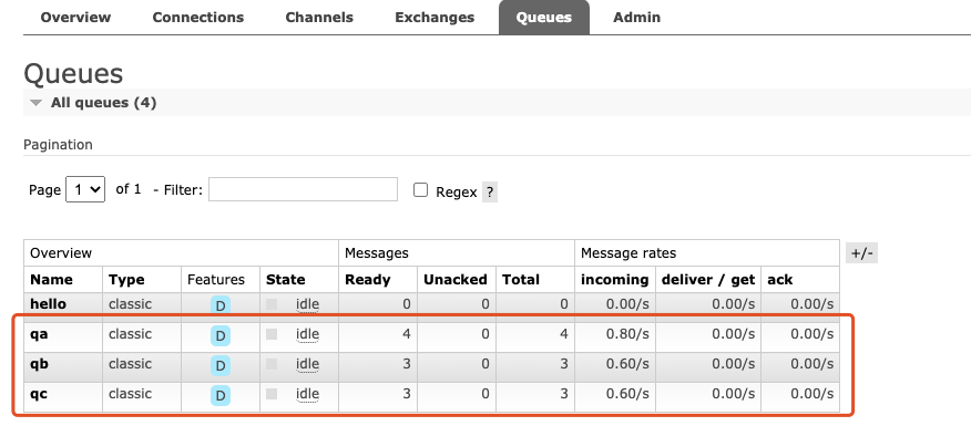 注意:往队列塞数据时,可能通过界面看不到消息个数的增加,可能是你之前已经开启了消费进程,导致增加的消息马上被消费了。