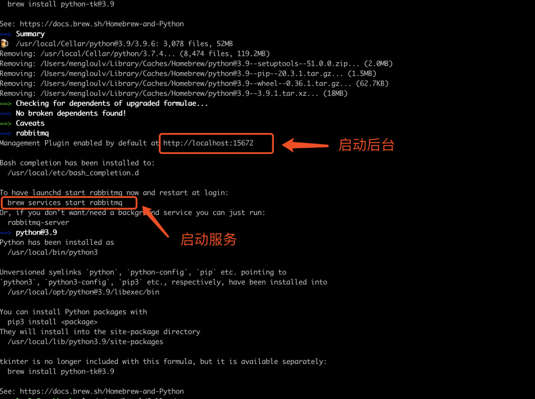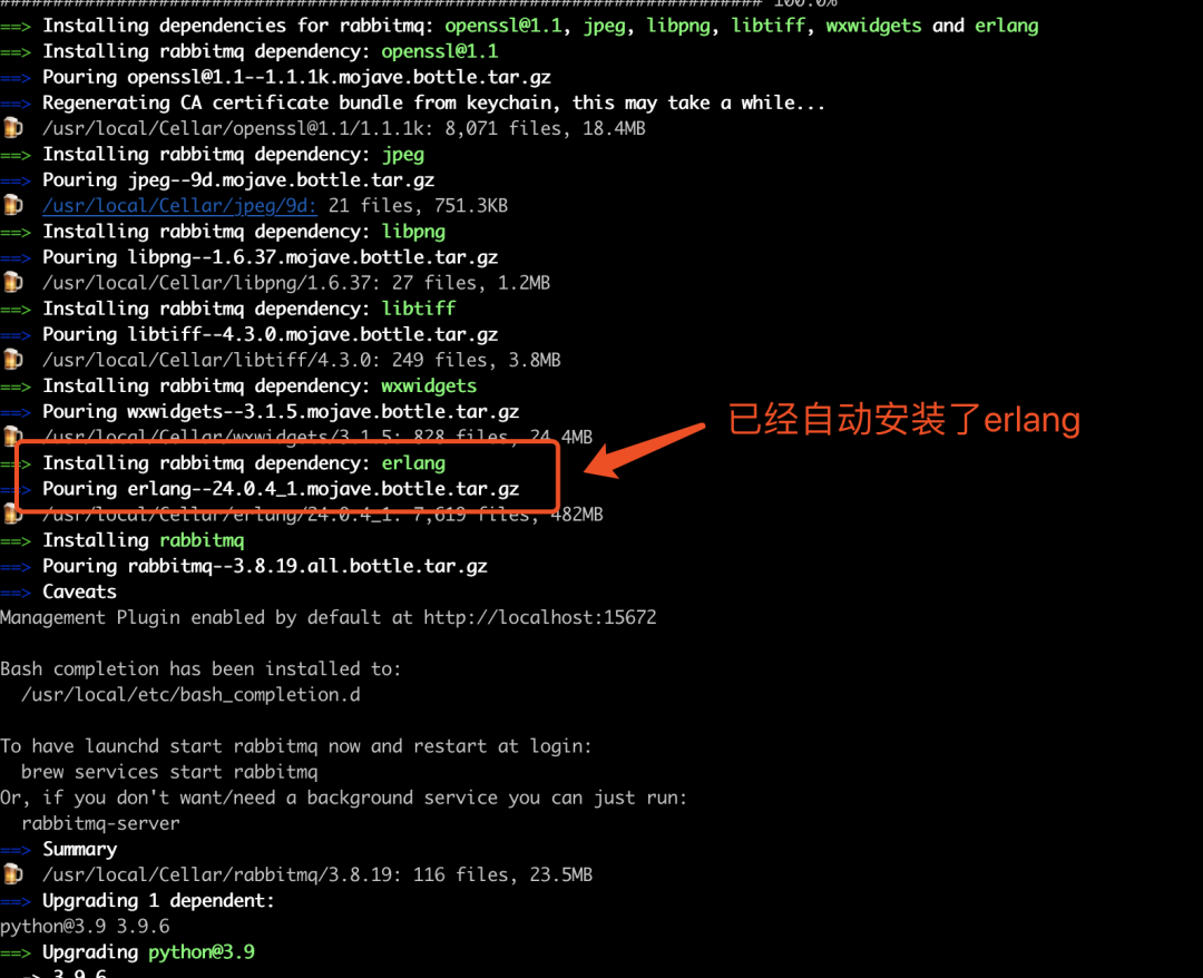 但是在执行“brew install rabbitmq”,会自动安装其它的程序,如果你使用源码安装Rabbitmq,因为启动该服务依赖erlang环境,所以你还需手动安装erlang,但是目前官方已经一键给你搞定,会自动安装Rabbitmq依赖的所有程序,是不是很棒!