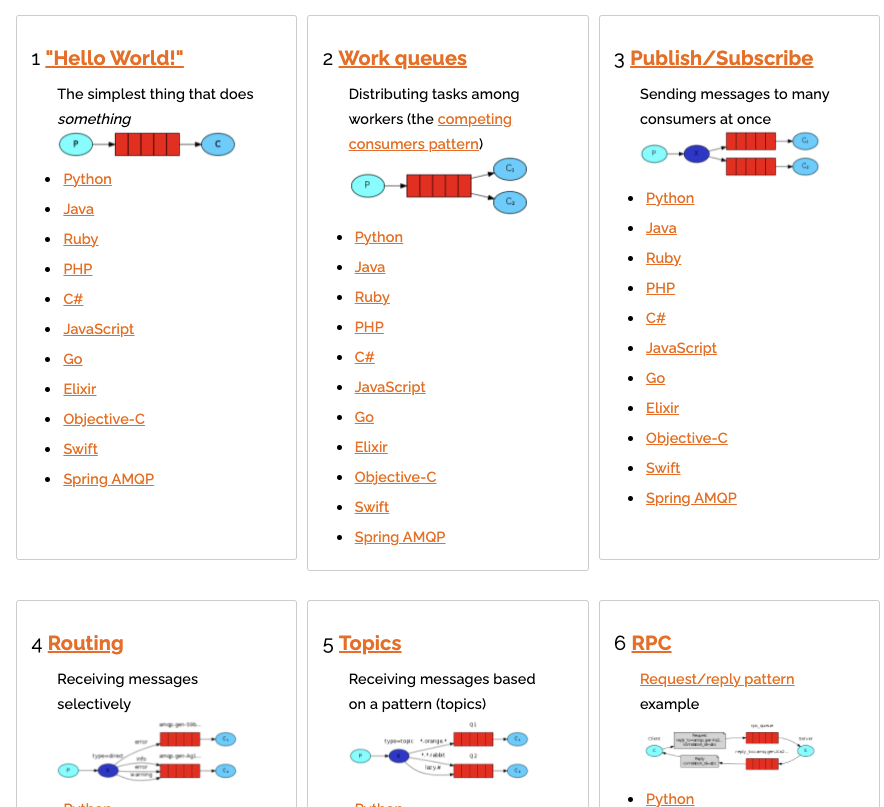 更多方式,请直接查看官网:https://www.rabbitmq.com/getstarted.html