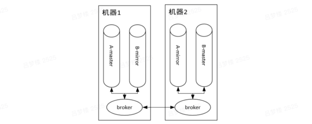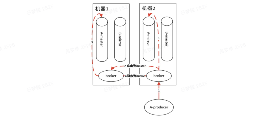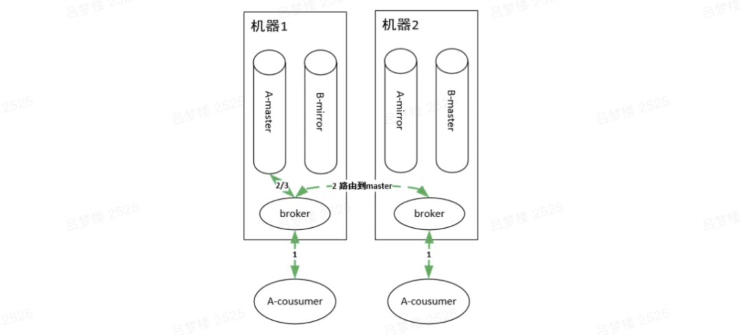 集群中有两个节点,每个节点上有一个broker,每个broker负责本机上队列的维护,并且borker之间可以互相通信。集群中有两个队列A和B,每个队列都分为master queue和mirror queue(备份)。那么队列上的生产消费怎么实现的呢?