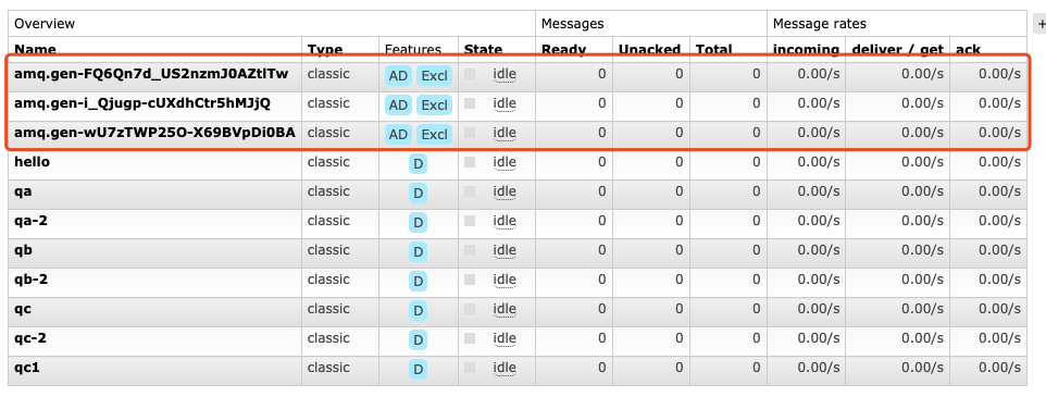 上面我们是指定了队列,这个方式其实很不友好,比如对于Fanout,我其实根本无需关心队列的名字,如果还指定对应队列进行消费,感觉这个很冗余,所以我们这里就采用随机获取队列名字的方式,下面代码直接Copy官网。