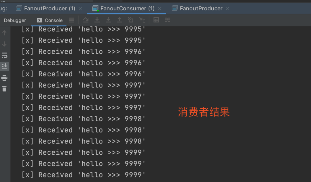 我们发现,生产者生产的10条数据,在每个消费者中都可以消费,这个是和Direct不同的地方,但是使用Fanout方式时,有几个点需要注意一下: