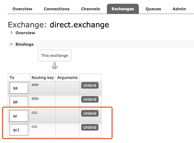 我们可以发现,多了一个qc1,所以可以判断这个界面中的queues,是消费者执行时,会将消费者指定的队列名称和direct.exchange绑定,绑定的依据就是key。