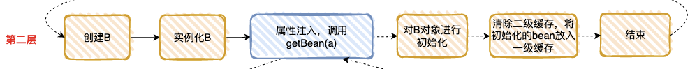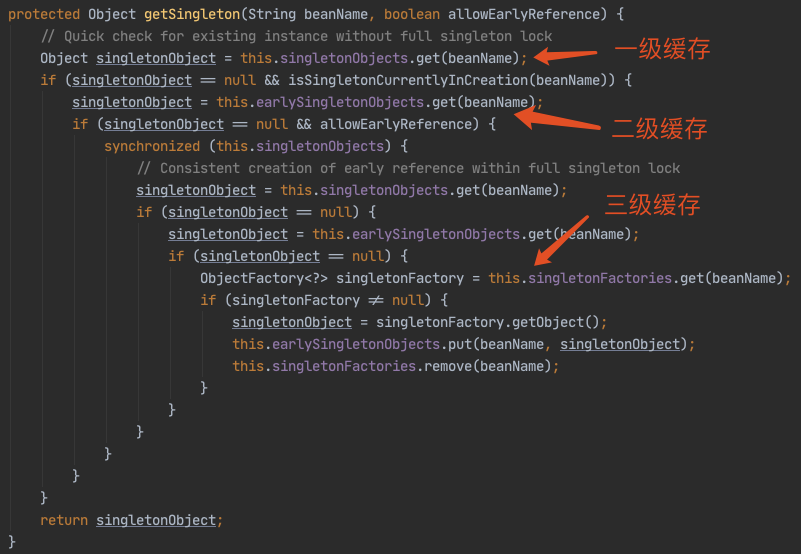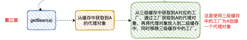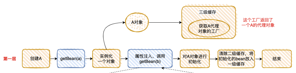 我们回到文章开头的例子,创建 A 对象时,会把实例化的 A 对象存入“三级缓存”,这个 A 其实是个半成品,因为没有完成 A 的依赖属性 B 的注入,所以后面当初始化 B 时,B 又要去找 A,这时就需要从“三级缓存”中拿到这个半成品的 A(这里描述,其实也不完全准确,因为不是直接拿,为了让大家好理解,我就先这样描述),打破循环。