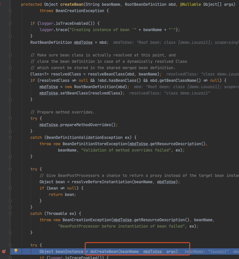 甭着急,看这里,还记得在 doGetBean() 中,我们会通过 createBean() 创建一个 louzai2 的 bean,当 louzai2 的 bean 创建成功后,我们会执行 getSingleton(),它会对 louzai2 的结果进行处理。