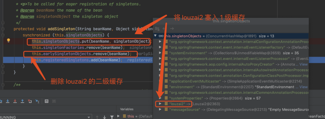 我们先说“一级缓存”的作用,变量命名为 singletonObjects,结构是 Map<String, Object>,它就是一个单例池,将初始化好的对象放到里面,给其它线程使用,如果没有第一级缓存,程序不能保证 Spring 的单例属性。