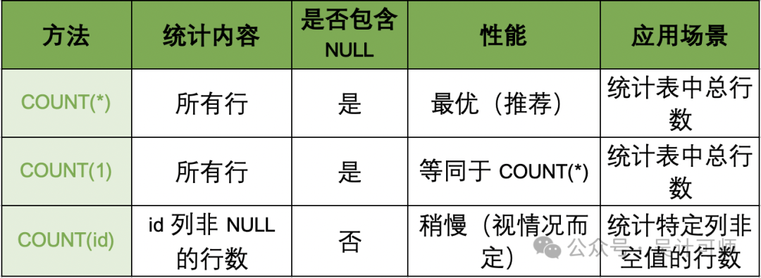 在 SQL 查询中,COUNT(*)、COUNT(1) 和 COUNT(id) 是常见的计数方式,它们的功能是统计记录数,但具体有什么不同?
