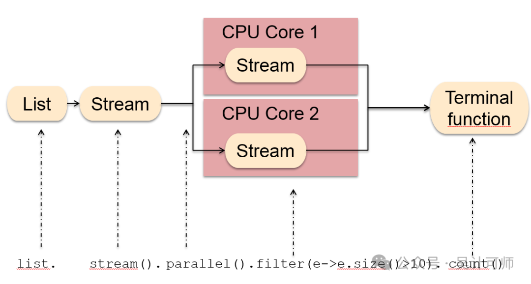 当我们调用 parallelStream() 时,Stream 会被分成多个部分,每个部分由不同的线程处理。Java 使用 数据分割(splitting)机制来把输入流分割成多个子流,这些子流是可以并行处理的。