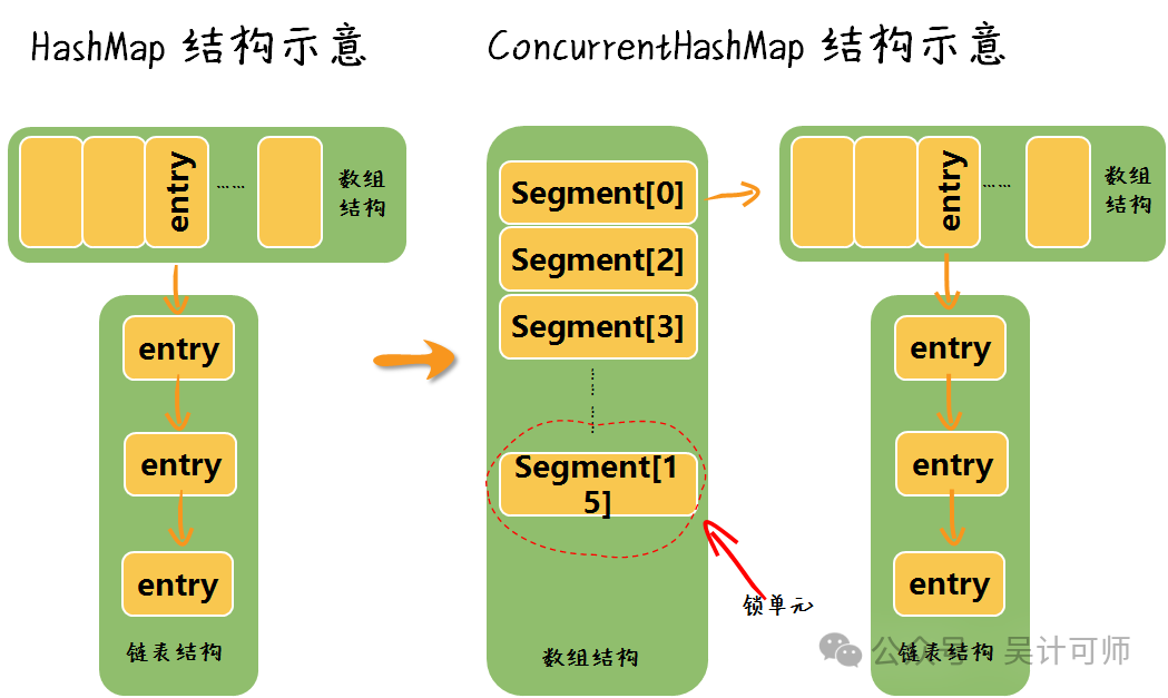 整个 ConcurrentHashMap 被分为多个 Segment,每个 Segment 独立维护其内部的哈希桶。